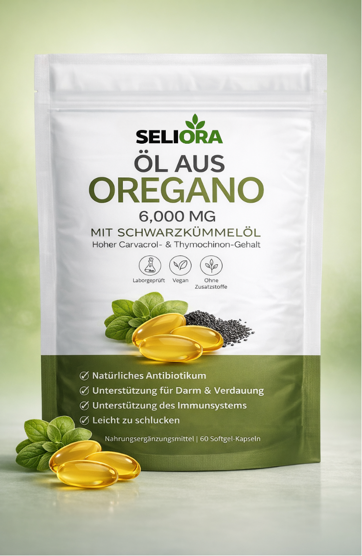 Seliora® ist ein hochwertiges Nahrungsergänzungsmittel in Form von Softgel-Kapseln. Es wurde entwickelt, um das Immunsystem, die Darmgesundheit und das allgemeine Wohlbefinden zu unterstützen. Die Formel kombiniert natürliches & hochqualitatives Oreganoöl mit Schwarzkümmelöl.